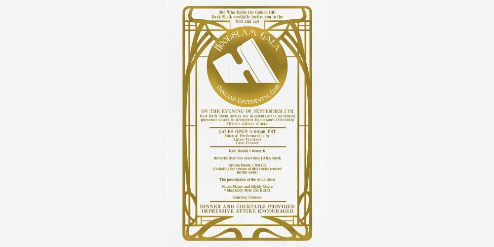 She Who Holds the Golden GiG DARK Sheik cordially invites you to the first and last Hoodslam Gala Oakland Continental Club On the evening of September 5th Host DARK Sheik invites you to celebrate the accidental phenomenon and to strengthen Hoodslam’s friendship with the nations of man. GATES OPEN 5:00PM PST Musical Performances by