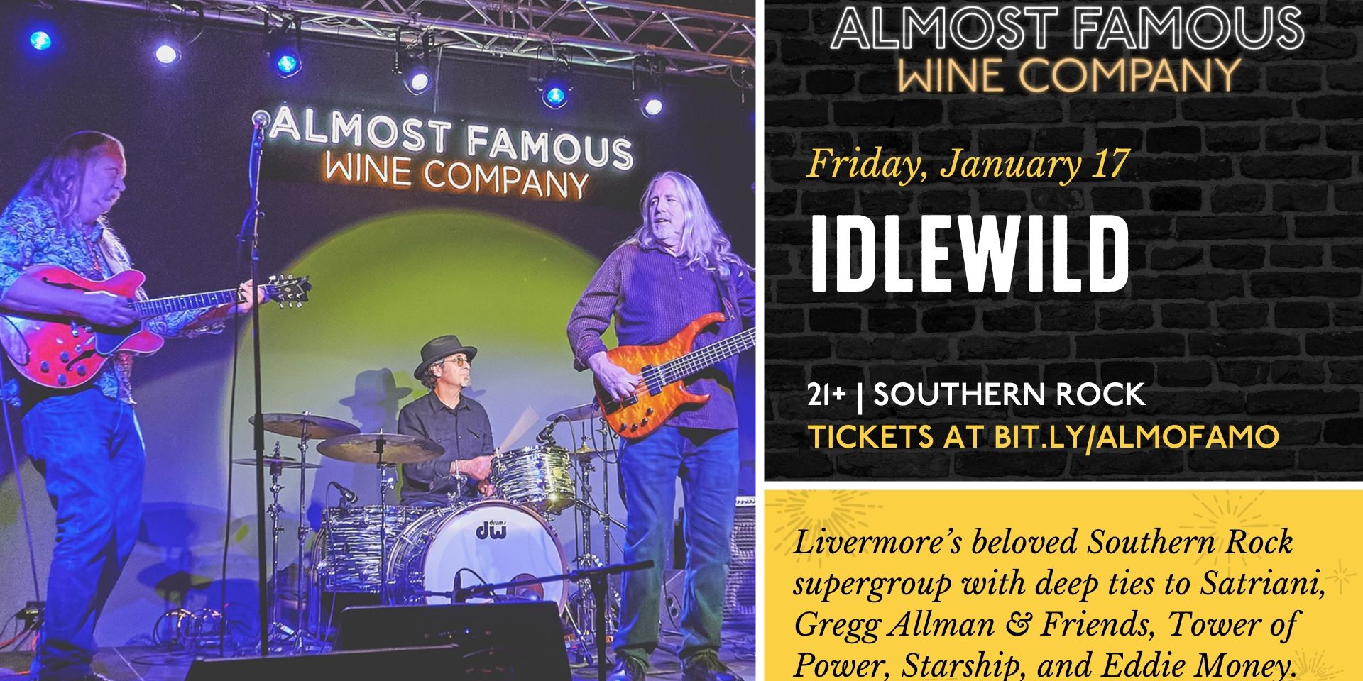 Idlewild is Livermore wine country’s beloved Southern Rock supergroup. The band features four veteran musicians with deep ties to the SF Bay’s musical legacy, including Joe Satriani, Gregg Allman and Friends, Tower of Power, Starship, Eddie Money, and more.